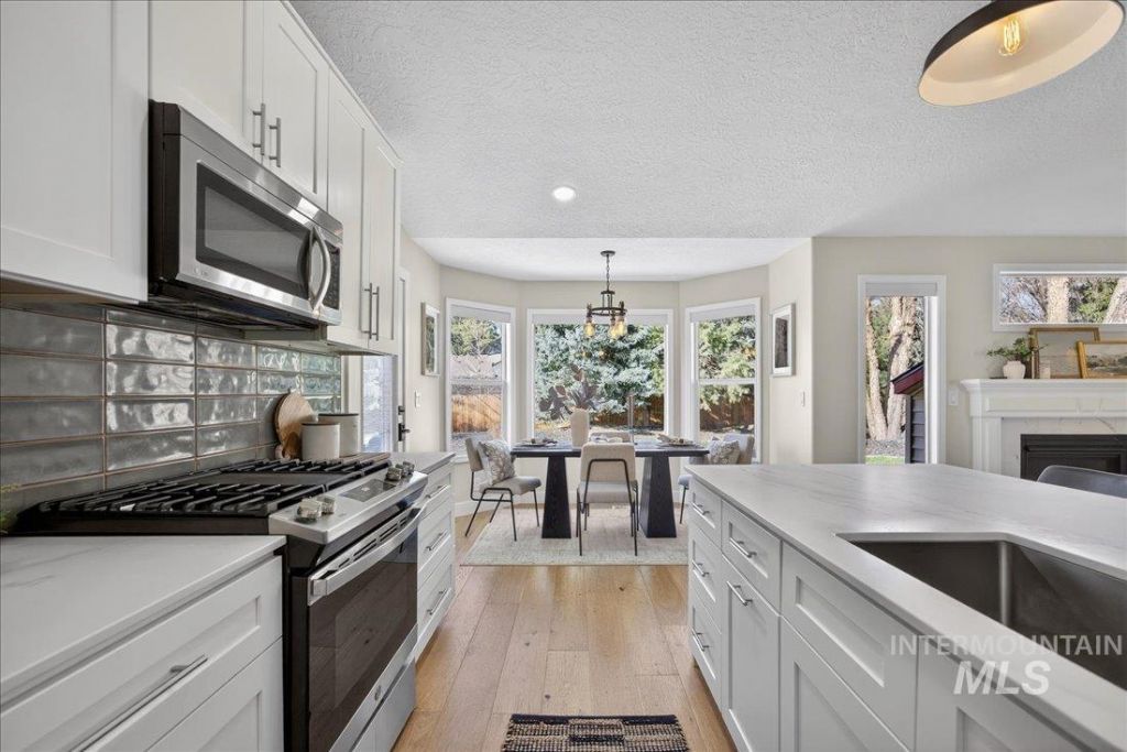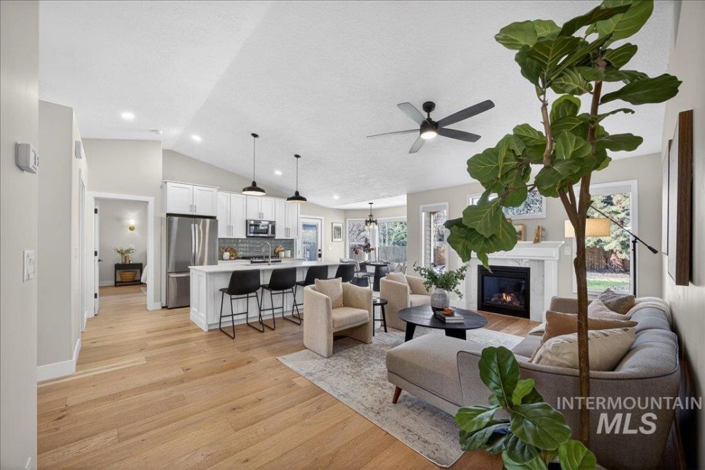 Quarter-Acre Privacy. Designer Remodel. Walk to Downtown Eagle. A quarter-acre lot you cant replicate this close to downtown. Fully fenced backyard with mature shade trees that keep the yard cool through Idaho summers, plus HOA-included irrigation water. Exceptional privacy and room to entertain. A 12x15 detached, finished flex space. Wood floors, mini-split heating and A/C, fully insulated. A true private workspace separated from the main house, ideal as a home office, gym, or studio without sacrificing a bedroom inside. A designer-led remodel. The 2023 renovation was led by a professional interior designer. Solid wood cabinetry with dovetail joinery, ultra-durable Dekton countertops, wide-plank engineered hardwoods, designer lighting, solid core doors, and custom trim throughout. Kitchen and living spaces opened up to live much larger than the square footage suggests. Big-ticket exterior items already done: new roof (2025), new vinyl siding (2026), new gutters. Plus gas fireplace, epoxy-coated garage floors, and full pressurized irrigation. Quiet cul-de-sac in Larue Acres. 0.4 miles to 10/10 Eagle Hills Elementary. 4-minute walk to the library and Eagle Farmers Market. 11-minute walk to downtown Eagle. Boise River Greenbelt is a 1.2-mile bike ride. Designer living, on a rare lot, in walkable Eagle.